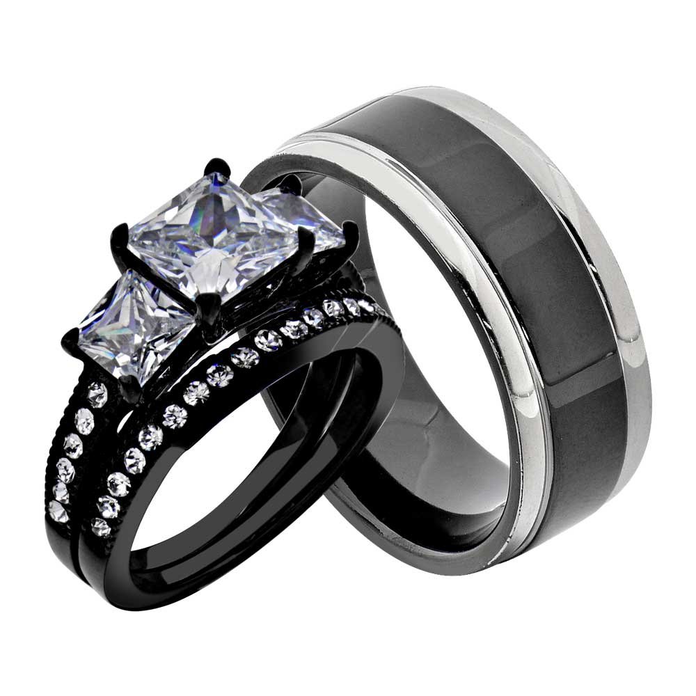Flamereflection Couple Ring Bridal Set His And Hers His And Hers Wedding Ring Set Black Stainless Steel Princess Cz Women S Ring Titanium Men S