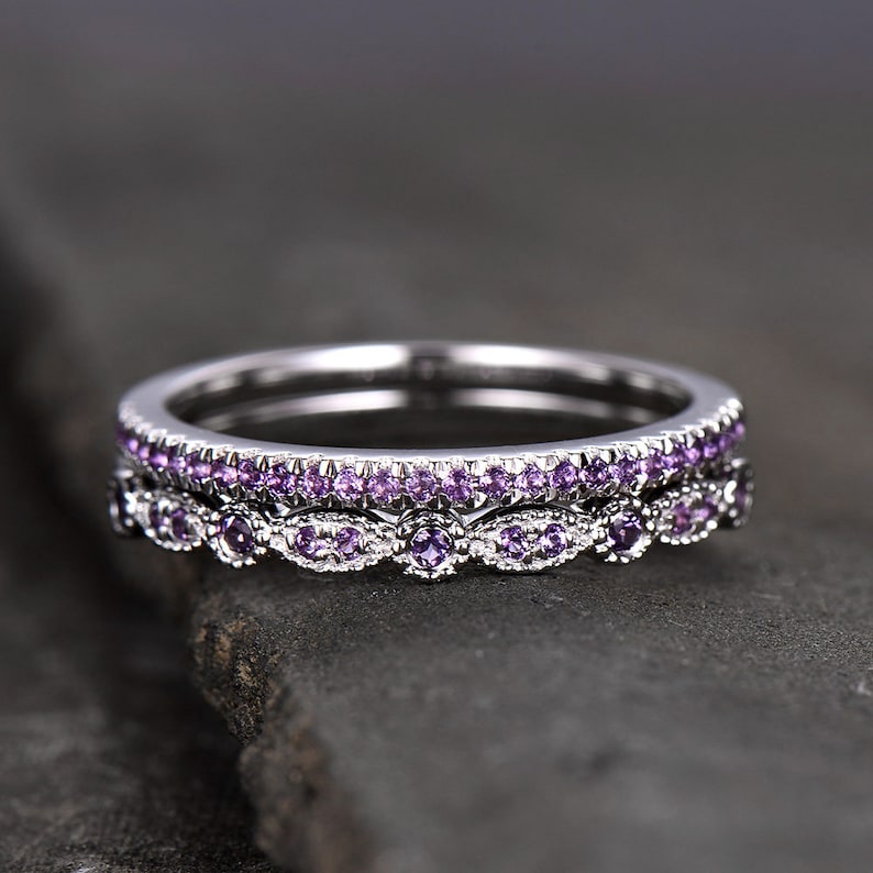 Purple Amethyst Wedding Band 925 Sterling Silver 14k Rose Gold Unique Stacking Ring Engagement Bridal Matching Women Promise Anniversary