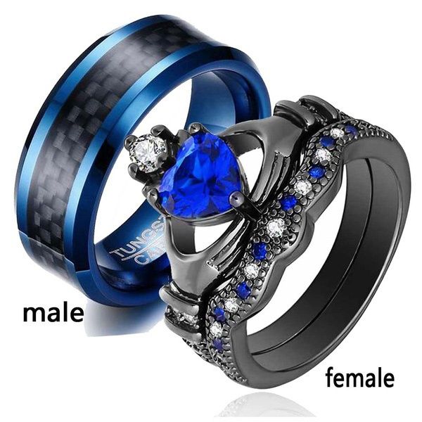 Sz5 12 Two Rings Couple Ring His Hers 1ct Heart Sapphire Cz Crown Women S Wedding Ring Sets Tungsten Steel Men S Ring Band
