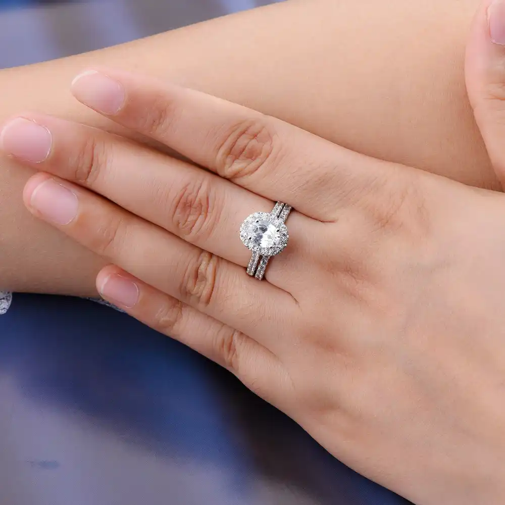 1 5 Carats Classic Oval Diamond Cz Halo Wedding Ring Sets 2 In 1 Real 925 Sterling Silver Engagement Ring For Women Bridal
