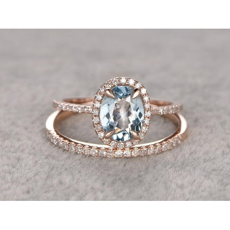 2 Carat Oval Cut Aquamarine And Diamond Halo Wedding Ring Set In Rose Gold