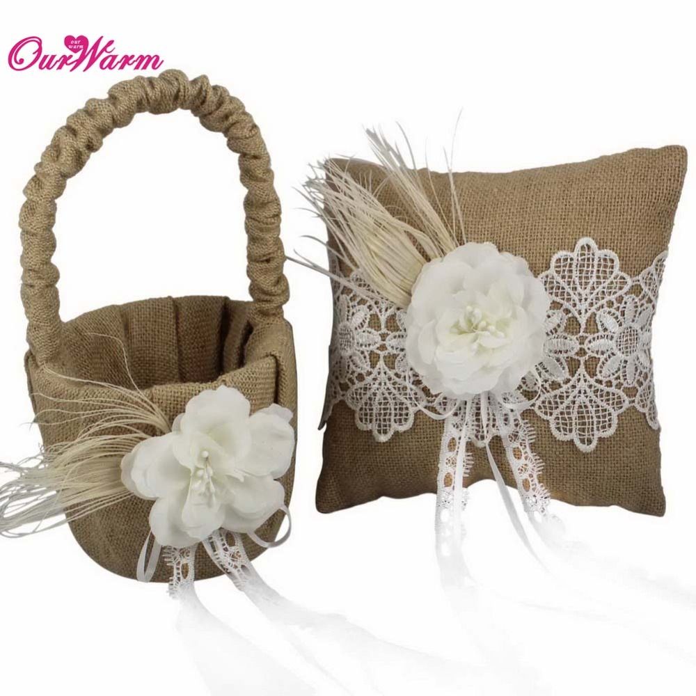 2pcs Set Jute Burlap Wedding Ring Pillow Flower Basket With Floral Lace Ribbon Rustic Flower Girl Basket For Wedding Decoration 16 No Trac