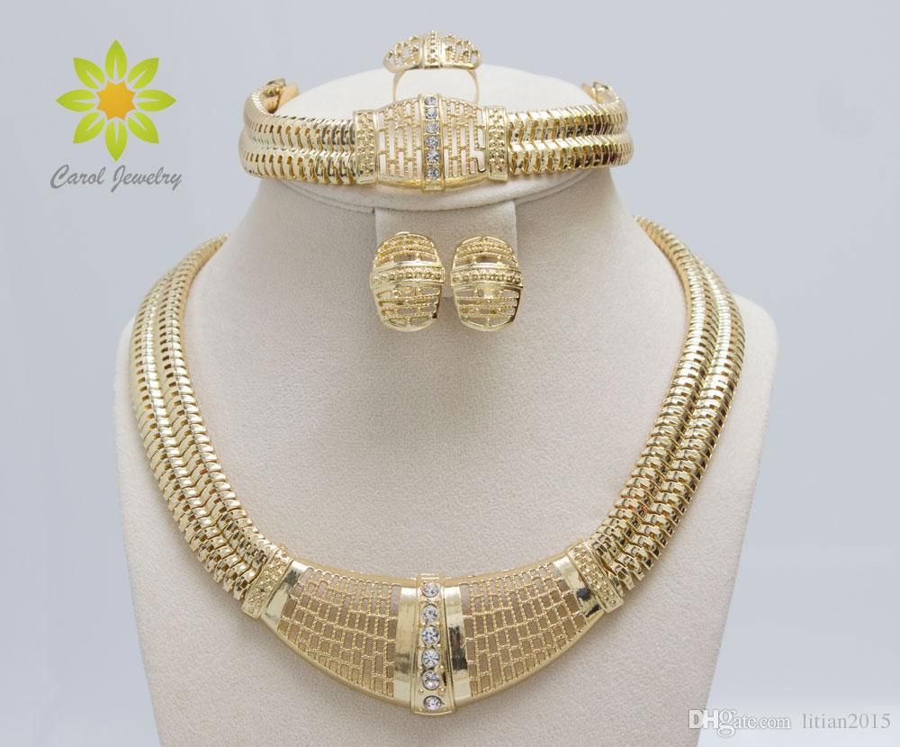 Free Shipping 18k Gold Filled Dubai African White Austrian Crystal Necklace Bracelet Earring Ring Wedding Bride Jewelry Set
