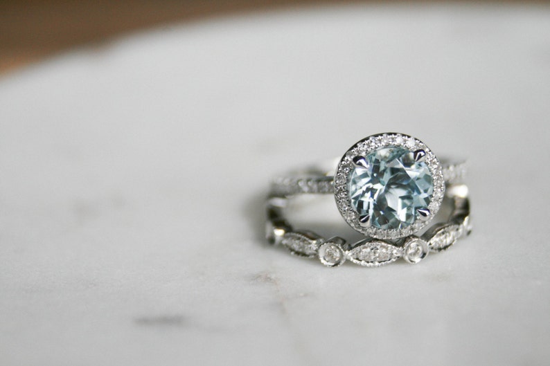 Round Aquamarine Wedding Set Diamond Halo Engagement Ring White Gold Art Deco Wedding Set
