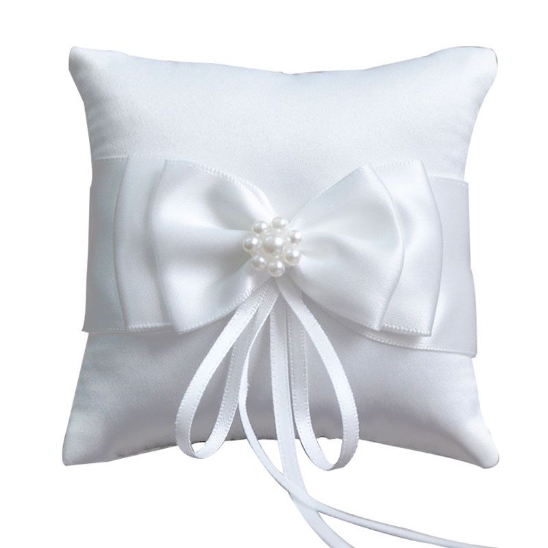 White Satin Bowknot Wedding Ring Pillow Rose Pearl Lace Bridal Cushion Bearer Ring Holder Beach Wedding Ceremony Pocket 20x20cm