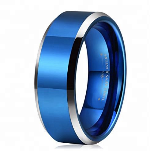 8mm Blue Black Mens Tungsten Wedding Band With Step Down Edges