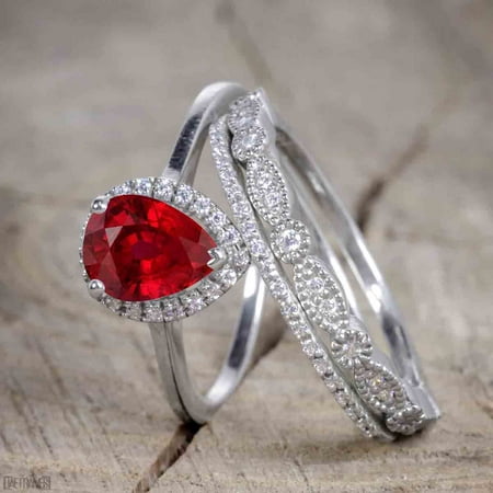 Bestselling 2 50 Carat Pear Cut Trio Wedding Ring Set With Ruby And Diamond On White Gold For Her