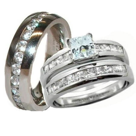 Hers And His Stainless Steel Princess Wedding Ring Set Titanium Wedding Band Women S Size 10 Men S Size 12