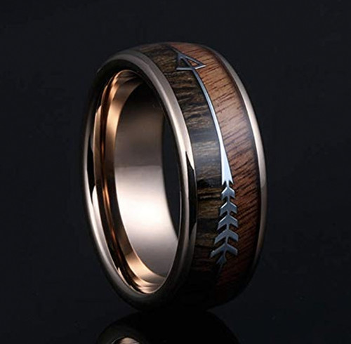 8mm Unisex Or Men S Tungsten Wedding Bands Rose Gold Cupid S Arrow Over Wood Inlay Tungsten Ring With High Polish Dark Wood Inlay Domed Top Ring