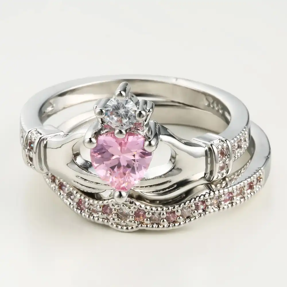 Trendy Claddagh Style Love Heart Cz Rings White Red Crystal Knot Women Biker Gift Crown Wedding Engagement Ring Set