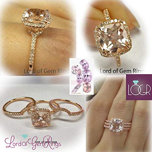 Cushion Morganite Ring Trio Bridal Set Contour Diamond Bands 14k Rose Gold 8mm