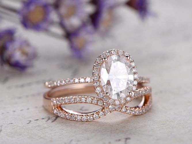 Moissanite Ring Bridal Set 6x8mm Oval Cut Moissanite Engagement Ring Curved Diamond Wedding Band 14k Rose Gold Ring Stacking Ring Customize