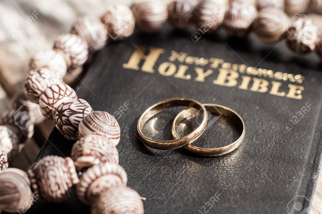 The Bible Is The Base Where Upon Two Wedding Rings Rest Stock Photo