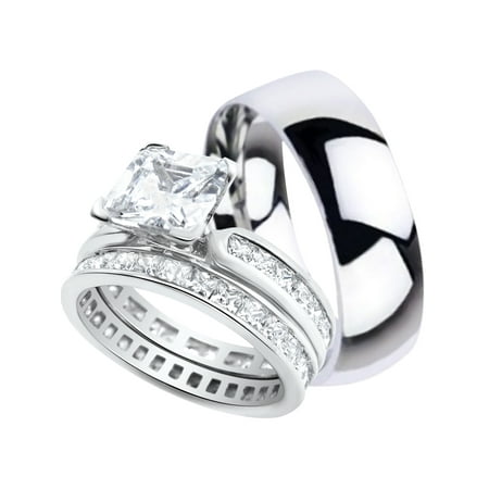 His Hers 4 Piece Cz Wedding Ring Set Sterling Silver Titanium Wedding Rings