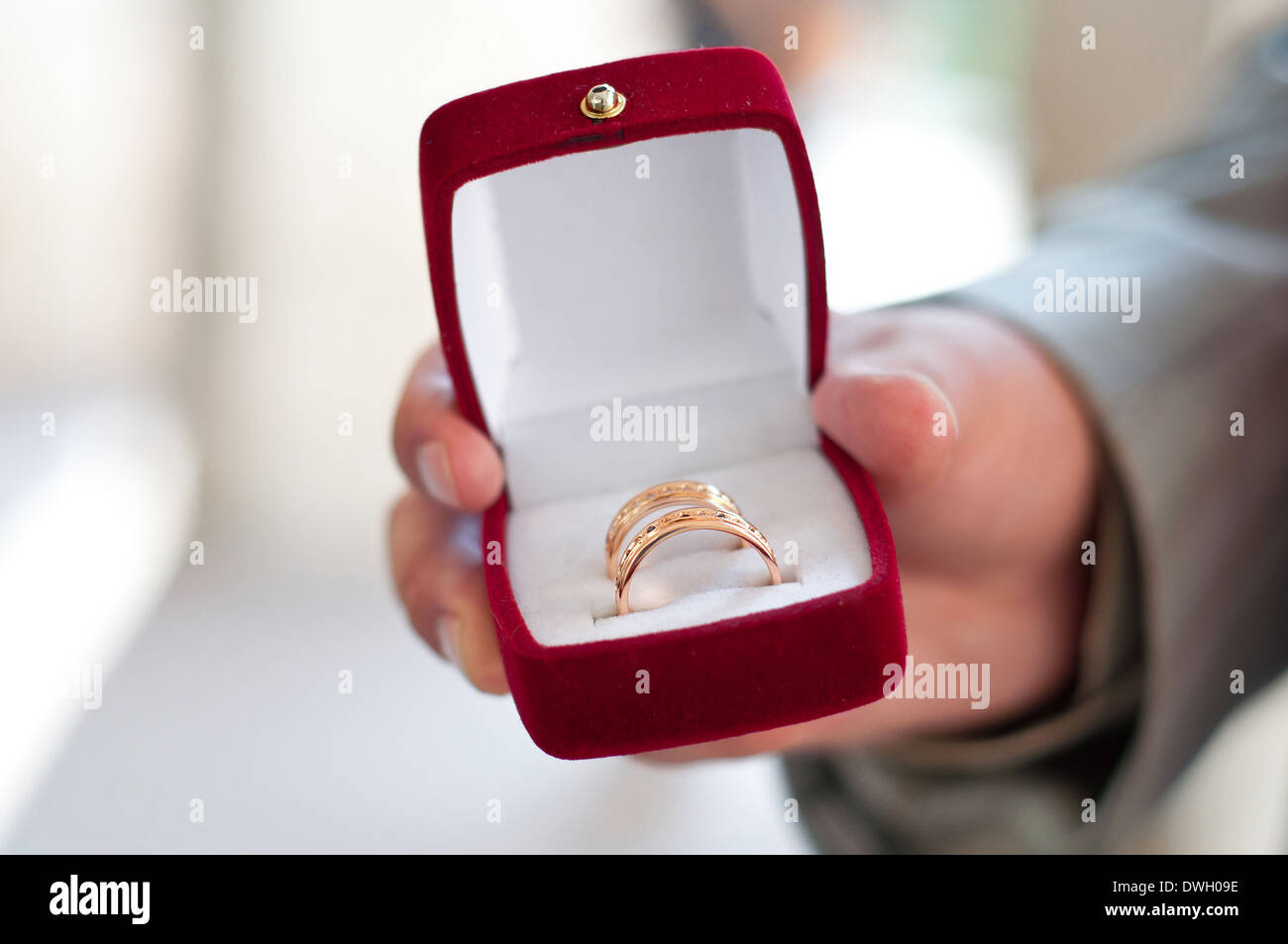 Wedding Rings In A Red Box In Hands Stock Photo 67370954 Alamy
