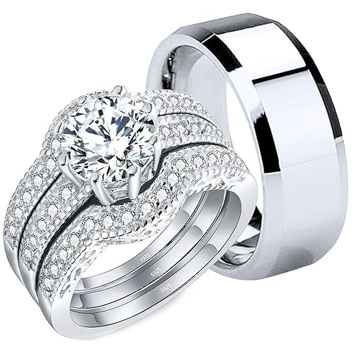 Mabella Couples Rings Her Halo Cz Sterling Silver Engagement Wedding Ring Sets His Stainless Steel Bands