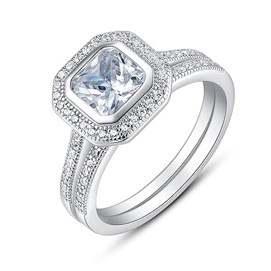Bl Jewelry Sterling Silver Cushion Cut Bezel Set Cubic Zirconia Bridal Engagement Wedding Ring Set