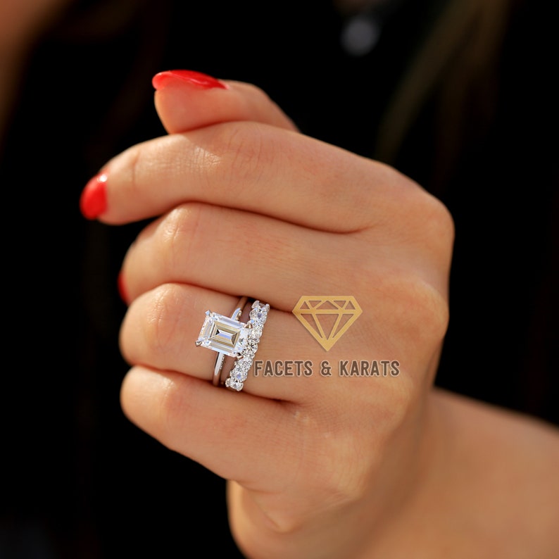 Emerald Cut Wedding Ring Set 2 50 Carat Solitaire Engagement Ring 1ct 7 Stone Simulated Diamond Wedding Band Set In 14k Solid White Gold