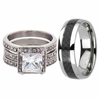 His Hers 3pcs Tungsten Men S Matching Band Sterling Silver Women S Bride Wedding Engagement Ring Set Www Devuggo Com