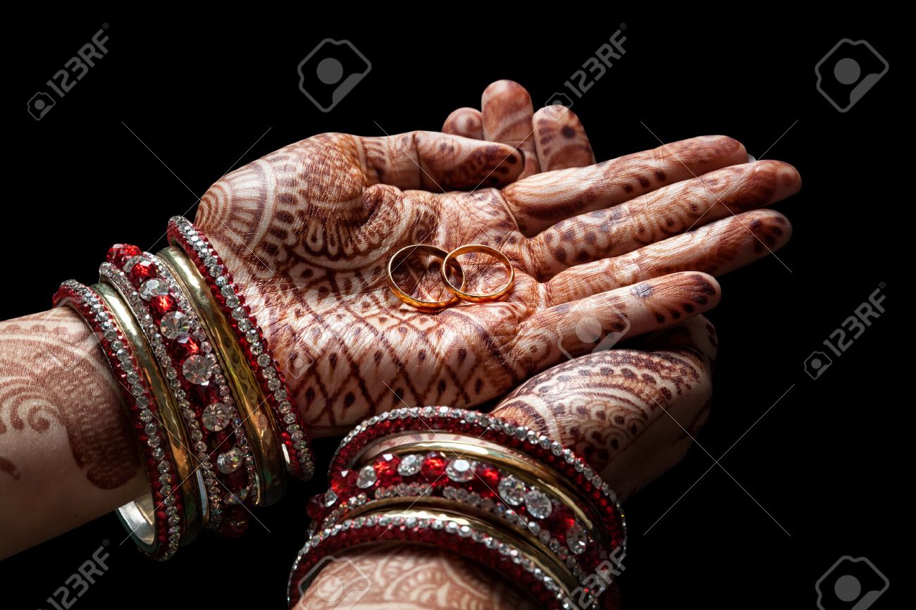 Woman Hands With Henna Holding Two Golden Wedding Rings On Black