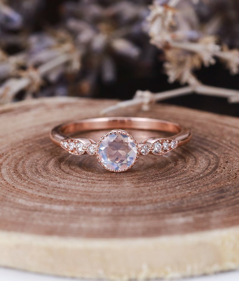 Moonstone Engagement Ring Women Rose Gold Vintage Round Cut Art Deco Antique Diamond Wedding Ring Jewelry Promise Anniversary Gift For Her