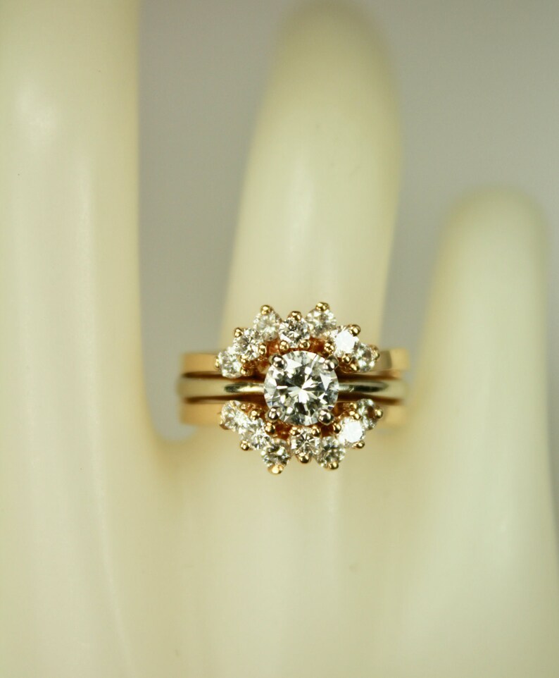 Vintage Ladies 14k Yellow White Gold Engagement Ring Wedding Band Bridal Set 58ct Solitaire Ring Guard 1 32ctw Diamonds Sz 5 25 C1960s