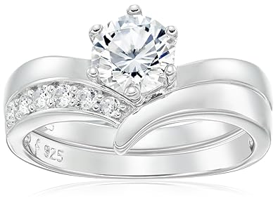 Platinum Plated 925 Sterling Silver Aaa Cubic Zirconia Round Solitaire Ring With Chevron Band Ring Set