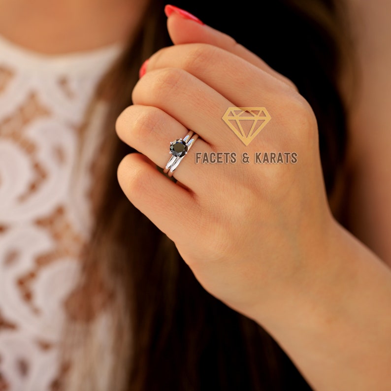 1 Carat Black Diamond Classic Solitaire Engagement Ring With Matching Plain Wedding Band Set In 14k Solid White Gold Avl Rose Gold Yellow