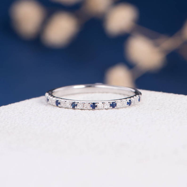 Stacking Wedding Band Blue Sapphire Diamond Minimalist Band Thin Multistone Wedding Ring September Birthstone Half Eternity Band Minimalist