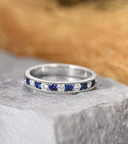 Natural Genuine Blue Sapphire Diamond Wedding Ring Band Solid 14k White Gold Half Eternity Channel Set Antique Stacking Matching Ring September