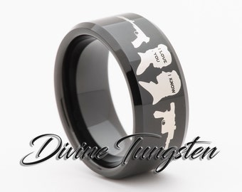 Star Wars Jedi Tungsten Wedding Band Mens Beveled Edges Black Tungsten Ring Rose Gold Custom Name Engraved Mens Promise Rings