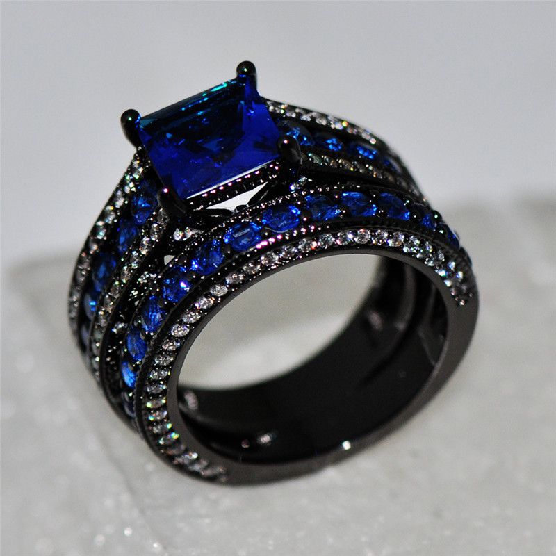 Geometric Blue Ring Sets Black Gold Filled Crystal Jewelry Vintage Wedding Rings For Women Bague Femme Gifts