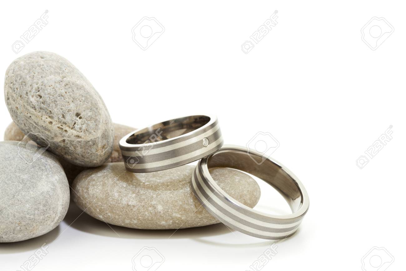 Closeup Of Wedding Rings Pair On Pebbles White Backgroud