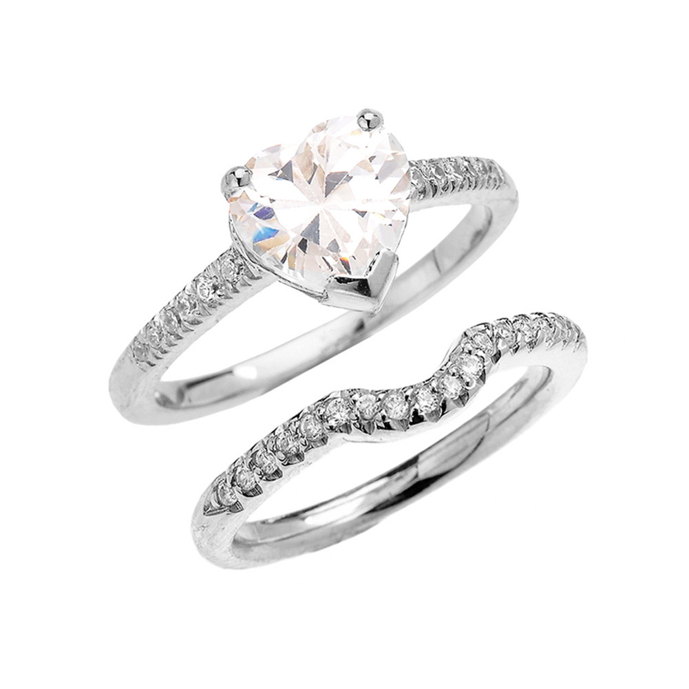 White Gold Dainty Diamond Wedding Ring Set With 3 Carat Heart Shape Cubic Zirconia Center Stone