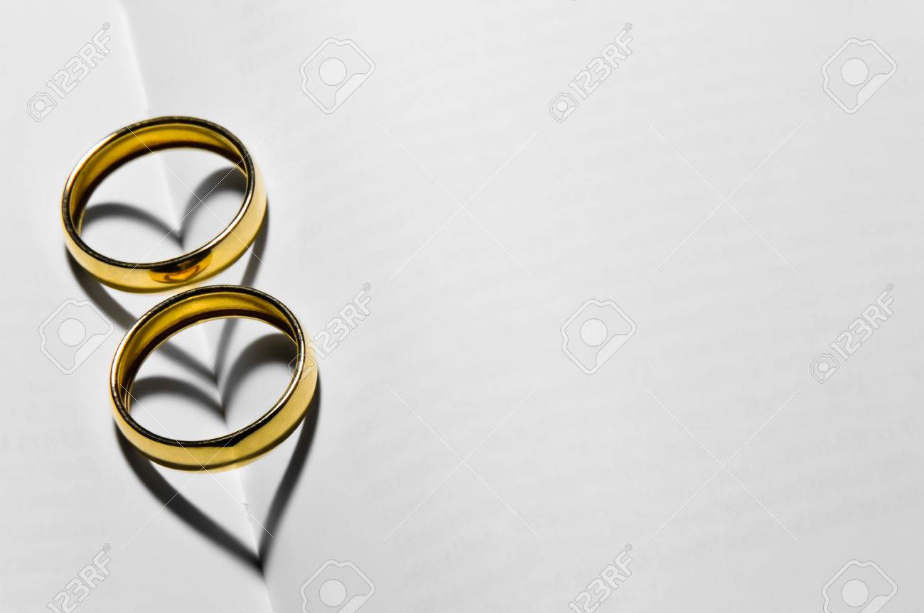 Two Wedding Rings On Top Of The Blank Pages That Form Two Hearts