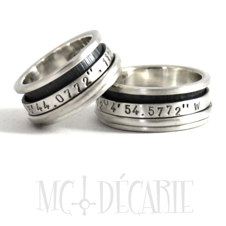 His And Hers 2 Spinner Ring Set In Silver Wedding Ring Set Unisex Sterling Silver Personalized With Engraving Coordinates Rings Ej103