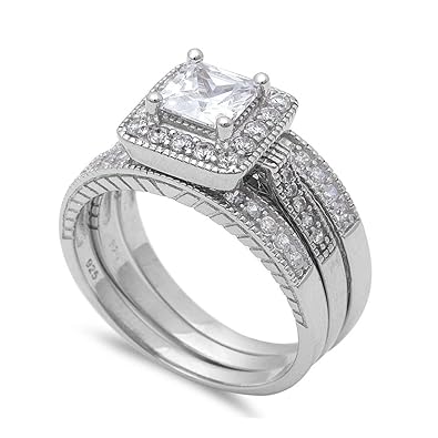 Blue Apple Co 3 Piece Halo Wedding Engagement Ring Trio Set Princess Cut Round Cubic Zirconia 925 Sterling Silver