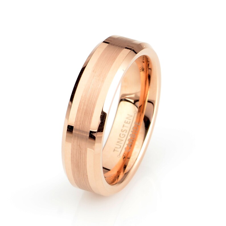 Rose Gold Plated Tungsten Ring 6mm Width Brushed Polished Beveled Edges Made In The Usa