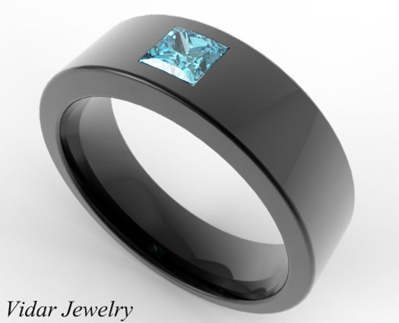 Men Wedding Band 14k Black Gold Princess Aquamarine Unique Wedding Ring Aquamarine Solitaire Ring For Man Aquamarine Men Ring