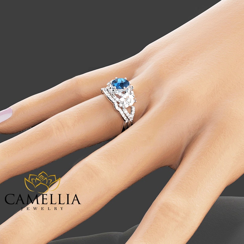 Art Deco Styled Topaz Bridal Set Unique 14k White Gold Engagement Rings London Blue Topaz Wedding Ring Set Floral Ring Set