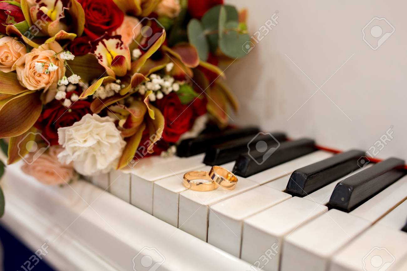 Big White Black Piano Keys And Two Wedding Rings Flower Bouquet
