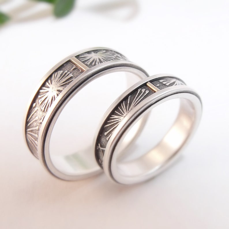 Wedding Ring Set Dandelion Sterling Silver Wedding Band Set 14k Gold Tab Womens Wedding Ring Mens Wedding Band Men S Wedding Ring