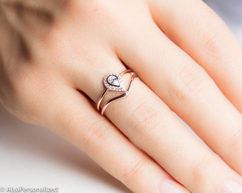 Pear Diamond Wedding Ring Set Unique Wedding Ring Women Minimalist Rose Gold Wedding Band Pear Cut Rose Gold 14k Engagement Ring Set