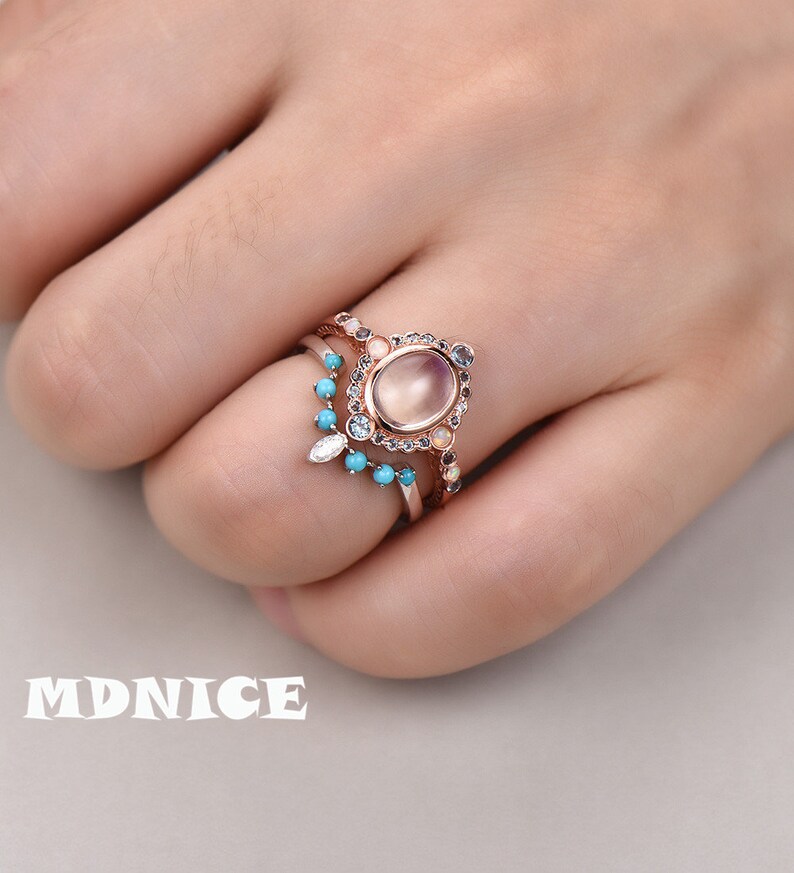 Vintage Bridal Set Ring Moonstone Engagement Ring 14k Rose Gold Turquoise Crown Curved Wedding Band Antique Unique Bridal Set Gift For Her