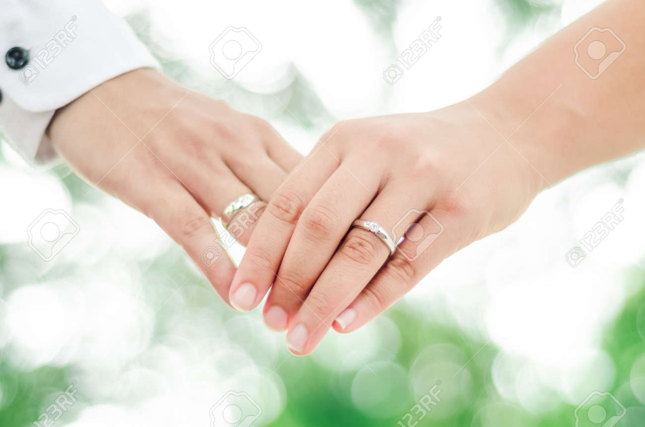 Female And Male Hand Wearing Engagement Ring Hold Hand In Hand