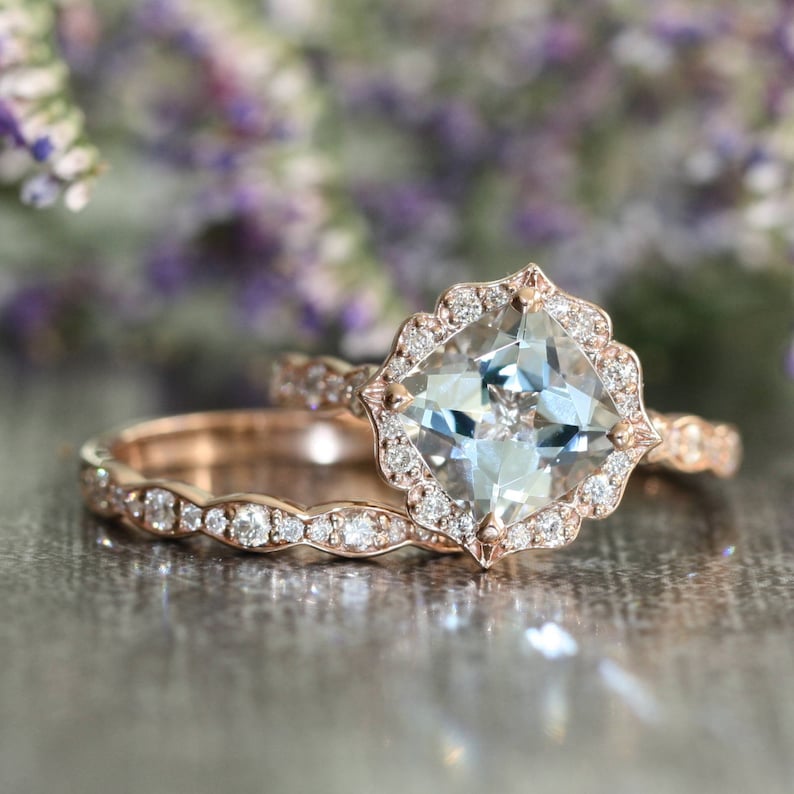 Vintage Floral Aquamarine Engagement Ring And Scalloped Diamond Wedding Band Bridal Set In 14k Rose Gold 8x8mm Cushion Gemstone Ring Set