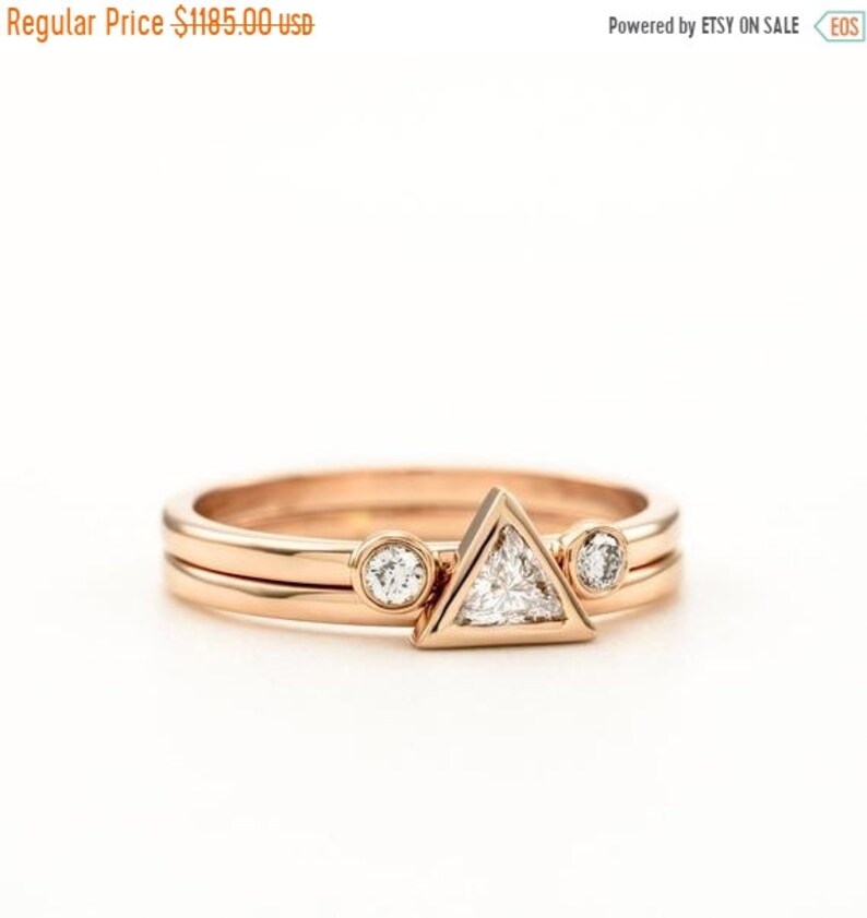 On Sale Bridal Ring Set Trillion Ring Triangle Engagement Ring Two Round Diamonds Wedding Ring Simple Engagement Ring Set