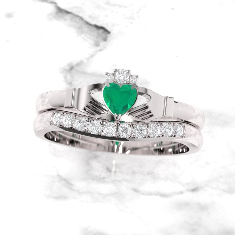 Claddagh Ring Set Emerald Claddagh Ring Diamond And Emerald Claddagh Ring With Complimenting Gently Curved Diamond Wedding Band