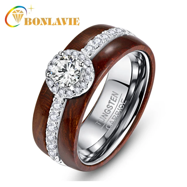 Us 24 25 50 Off Bonlavie Exquisite Tungsten Carbide Steel Ring With Silver Zircon Real Polished Koa Wood Rings For Women Wedding Jewelry In Wedding