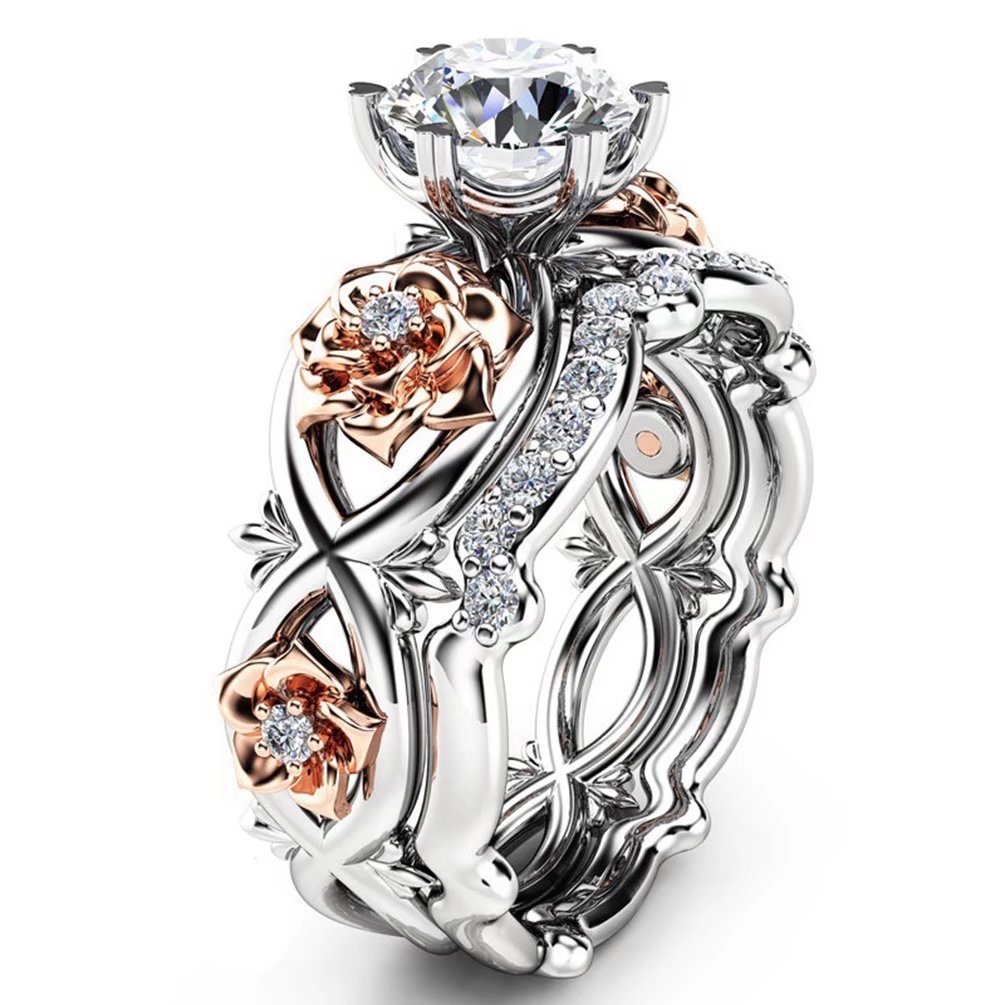 Fendina Women S Gorgeous 2 Pcs Cz Vintage Engagement Wedding Ring Set Lotus Flower Rose Gold Plated Two Tone Bridal Eternity Rings